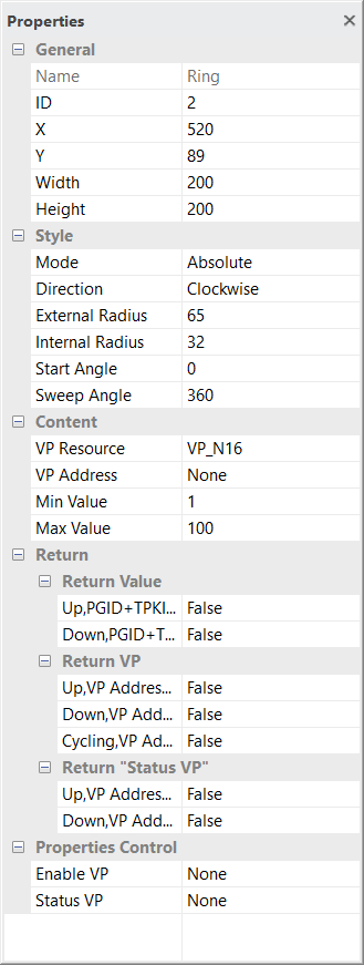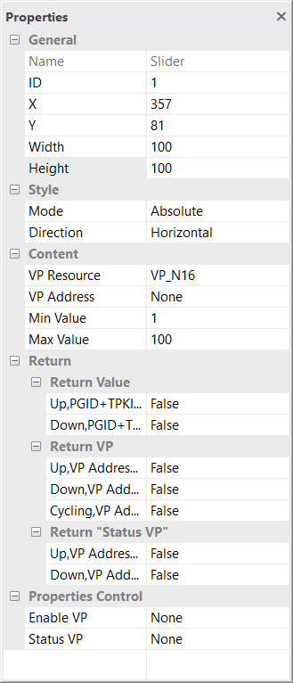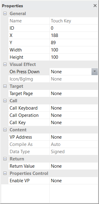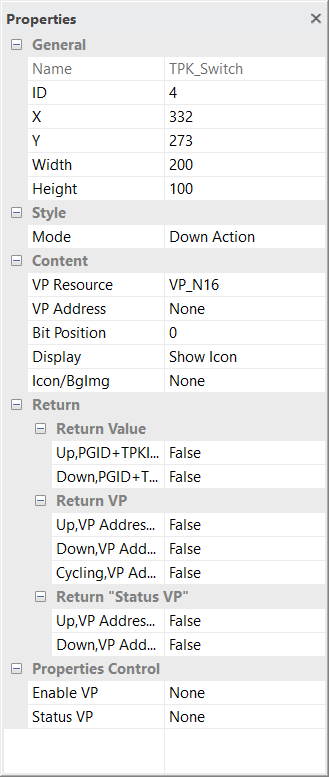 Properties Control (advance feature) Enable VP is none by default (element operate normally) Select a VP for real time element control. VP value will set to 1 as enable at power-on. It can be disabled (hidden) by a zero value Status VP is none by default Select a VP for storing the real time status (0=no touch, 1=touch down)
