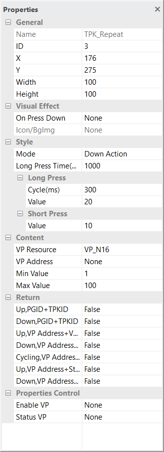 Style Mode is touch action moment Down Action will trigger the Short Press feature while touch down Up Action will trigger the Short Press feature while touch up Long Press Time is the time for Long Press feature to be trigger Long Press Cycle is the repeat action cycle time for long Press Long Press Value is operation (VP:=VP+value) value for Long Press Short Press Value is the operation (VP:=VP+value) value for Short Press (negative value for minus operation)
