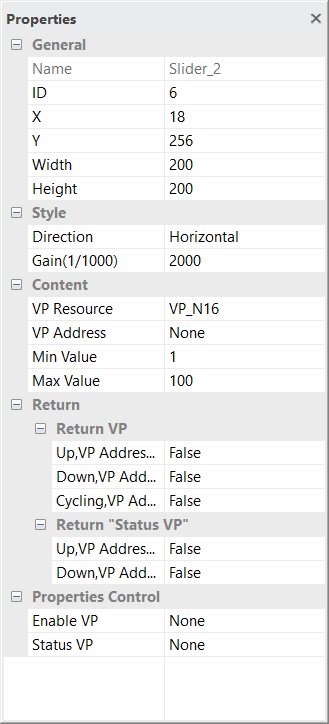 Style Direction is for the two pint sliding sense direction Horizontal=horizontal sliding Vertical=vertical sliding Gain defines the two pint sliding amplification Smaller value make the move-to-value gain less Bigger value make the move-to-value gain more (Sweep should start on screen area without any other touch element)