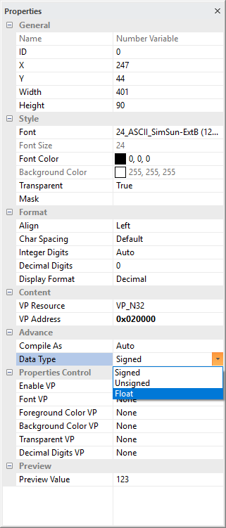 - For showing floating point value that hold in the VP, Data Type have to selected as "Float"
